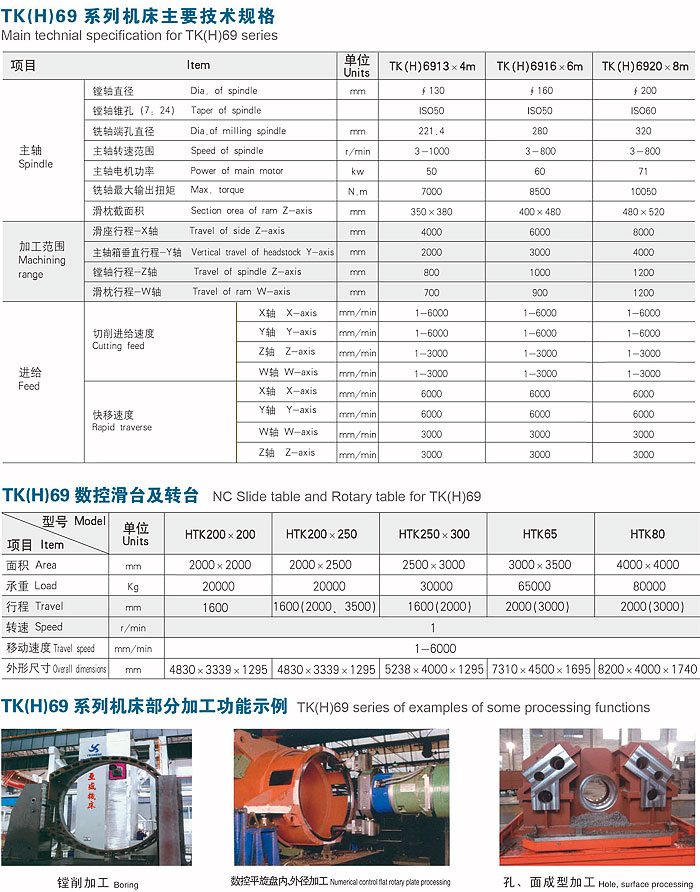 TK(H)69系列數(shù)控落地鏜銑床、加工中心 ● 機(jī)床整體結(jié)構(gòu) 該系列機(jī)床采用方滑枕型側(cè)掛主軸箱、單移動(dòng)立柱、床身和平臺(tái)分體的落地式布局。鏜軸包容于銑軸內(nèi),隨銑軸一起支承在方滑枕內(nèi)。立柱沿床身導(dǎo)軌橫向移動(dòng)形成x軸進(jìn)給運(yùn)動(dòng),主軸箱沿立柱導(dǎo)軌垂直移動(dòng)形成Y軸進(jìn)給運(yùn)動(dòng),鏜軸沿銑軸縱向移動(dòng)形成z軸進(jìn)給運(yùn)動(dòng),方滑枕沿主軸箱封閉式矩形導(dǎo)軌縱向移動(dòng)形成w軸進(jìn)給運(yùn)動(dòng)。 ● 工藝保障 機(jī)床基本件由床身、滑座、立柱、主軸箱等組成,材質(zhì)為HT250 3∞優(yōu)質(zhì)合金耐磨鑄鐵.經(jīng)振動(dòng)時(shí)效一熱爐時(shí)效一振動(dòng)時(shí)效一粗加工一振動(dòng)時(shí)效一半精加工一熱爐時(shí)效一振動(dòng)時(shí)效一精加工而成,消除工件內(nèi)應(yīng)力,以確保機(jī)床的長(zhǎng)期運(yùn)行精度。