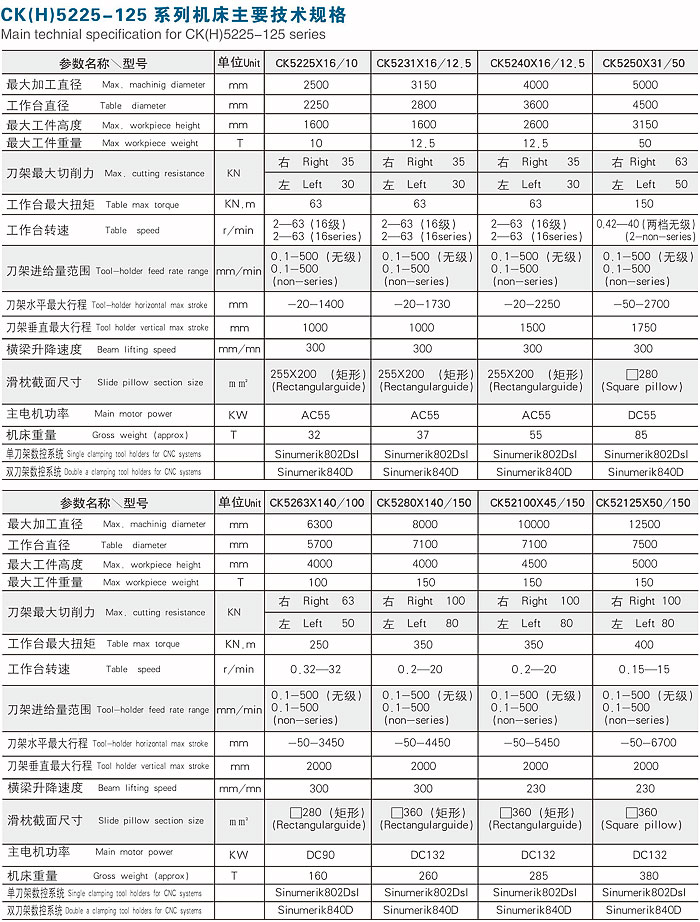 CK(H)5225-125系列數(shù)控雙柱立式車床 ● 機床簡介 該系列機床適用于高速鋼,硬質(zhì)合金刀具及陶瓷刀具,用于對黑色金屬,有色金屬及部分非金屬零件的粗、精加工。工作臺恒流靜壓系統(tǒng)為同步馬達分油器。使液壓系統(tǒng)工作更加穩(wěn)定可靠,電氣控制為PLC程序控制器控制。減少控制元件,減少故障率。使機床動作更準確可靠。 ● 機床基本件 由底座、工作臺、左右立柱、橫梁、連接梁、龍門頂?shù)冉M成,材質(zhì)為HT250-300優(yōu)質(zhì)合金耐磨鑄鐵,經(jīng)振動時效一熱爐時效一振動時效一粗加工一振動時效一半精加工一熱爐時效一振動時效一精加工而成,消除工件內(nèi)應(yīng)力,以確保機床的長期運行精度。