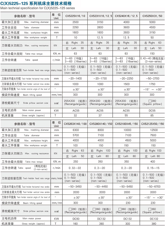 C (X) 5225-125 series of ordinary (digital) double column vertical lathe ● Introduction to machine tools The series of machine tools for high-speed steel, carbide cutting tools and ceramic tools for ferrous metals, non-ferrous metals and some non-metallic parts of the rough, finishing. Worktable constant current hydrostatic system for synchronous motor oil separator. So that the hydraulic system work more stable and reliable. The electrical control for the PLc program controller controls the reduction of the control element. Reduce the failure rate. So that the machine moves more accurate and reliable. ● Machine basic parts By the base, the table. Around the column, beams, connecting beams, gantry and other components, material for the HT250-300 quality alloy wear-resistant cast iron. The vibration aging of a hot furnace aging a vibration aging a roughing a vibration aging half of a finishing furnace a time of vibration aging finishing a work to eliminate the workpiece stress to ensure long-term operation accuracy of the machine.
